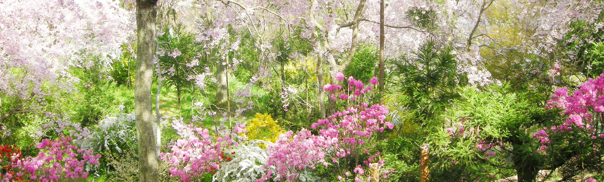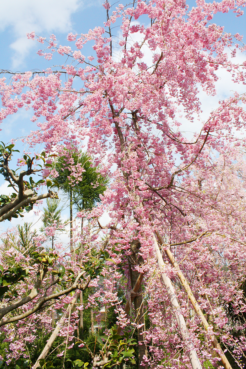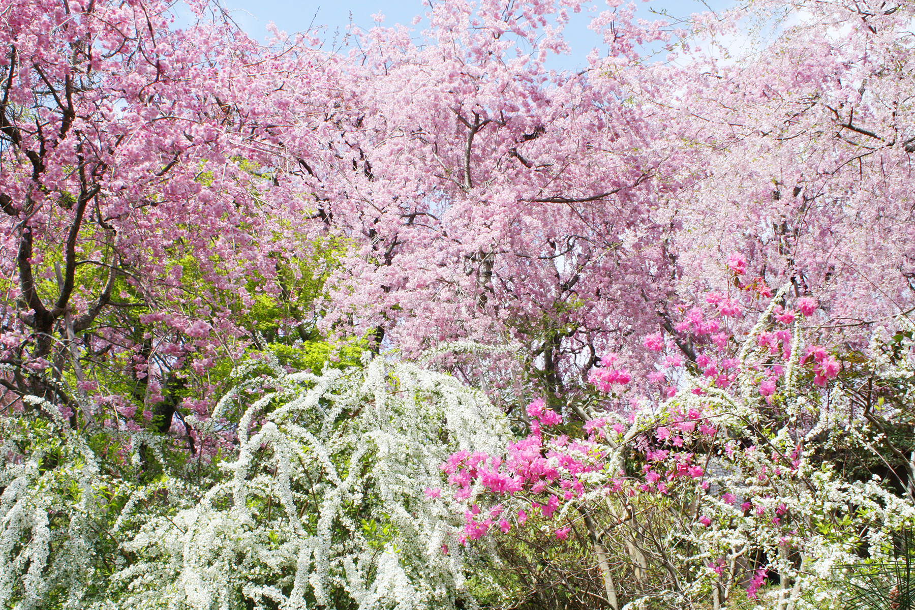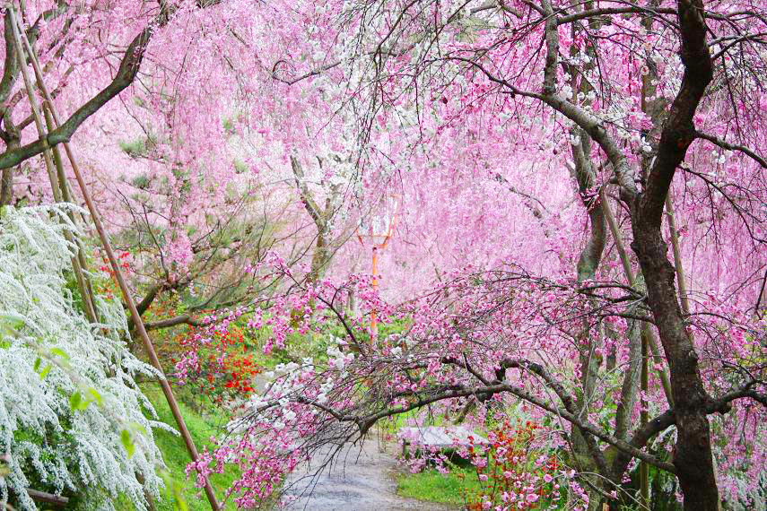 満開の桜に包まれる春の庭、木漏れ日がやさしく差し込む小径——