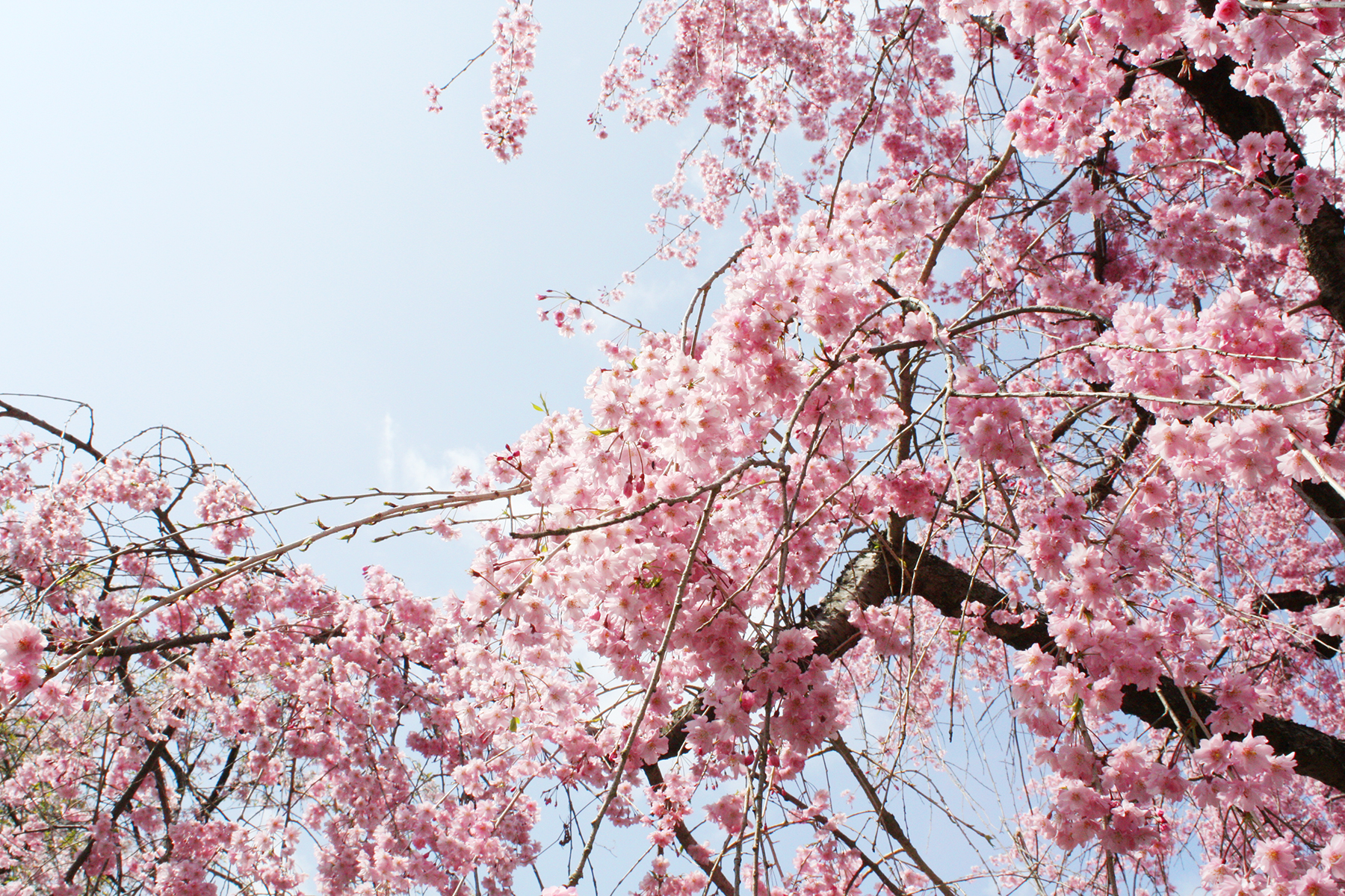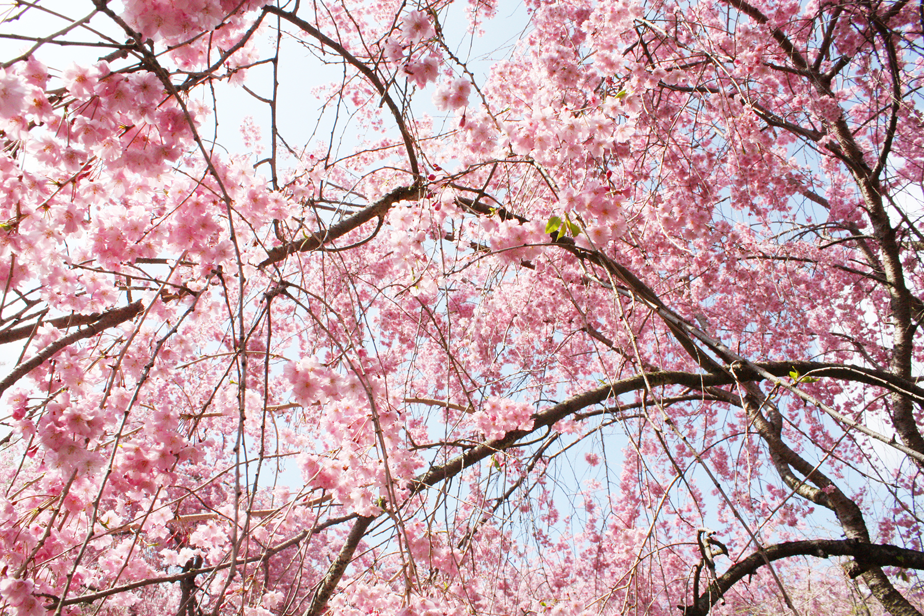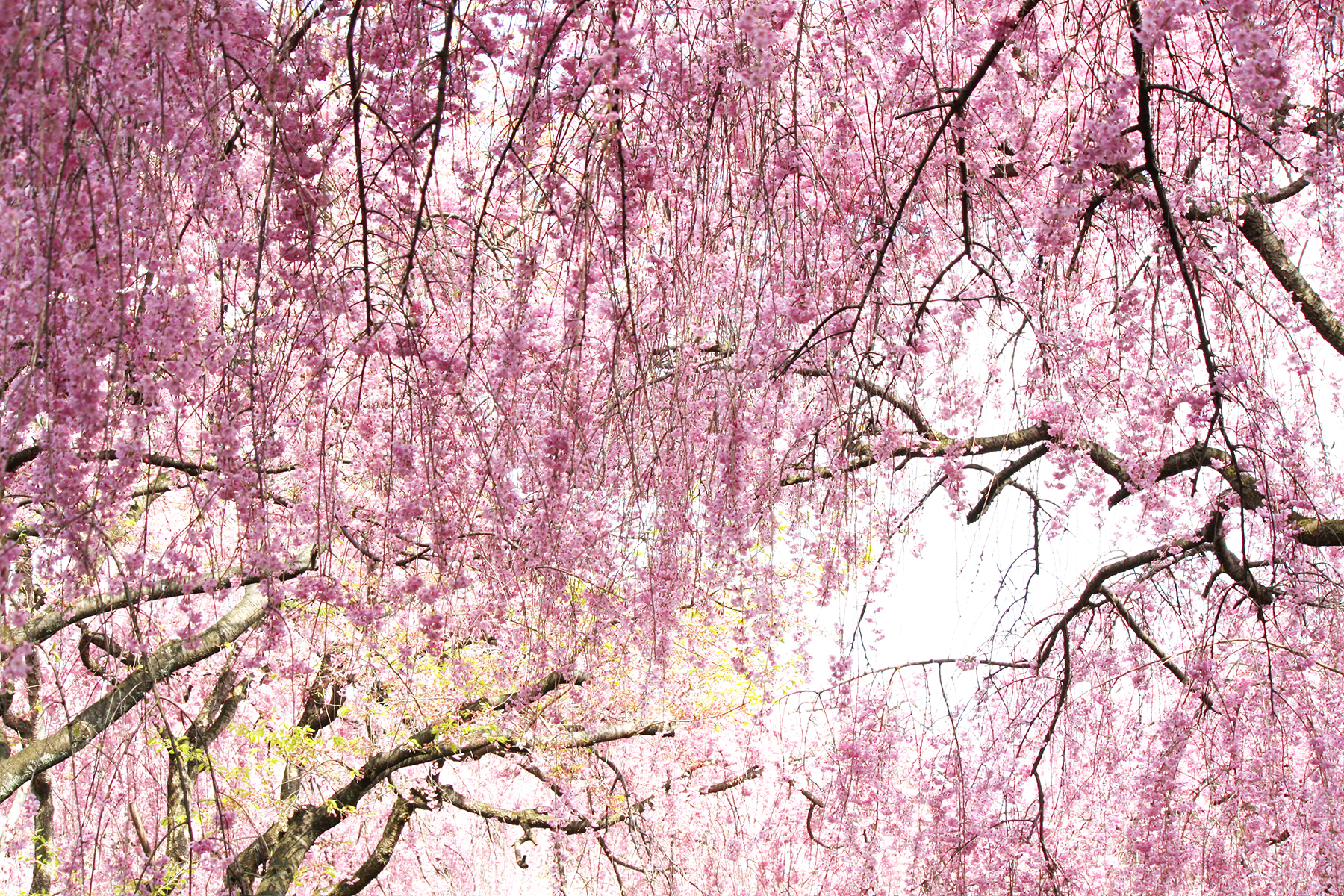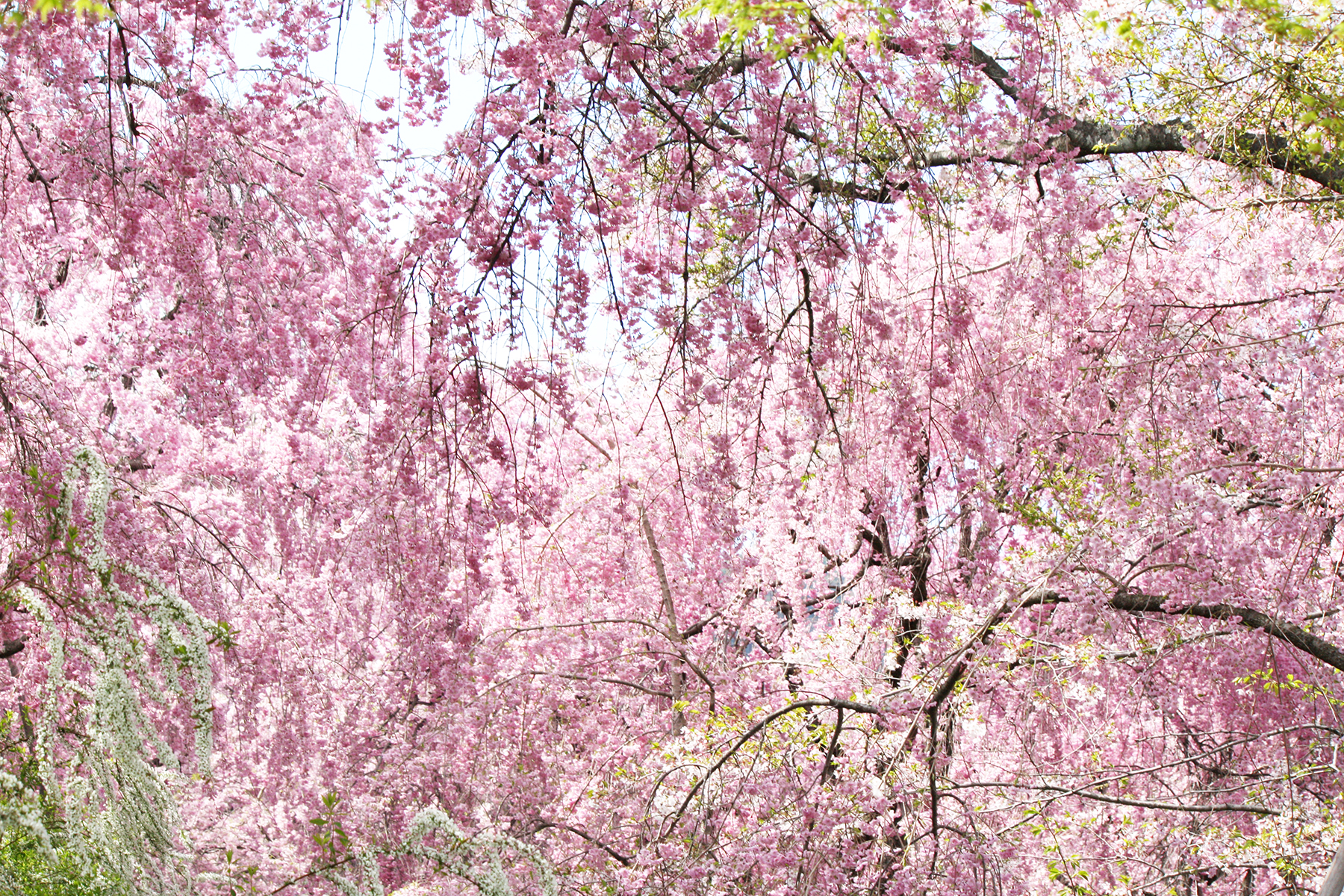 満開の桜に包まれる春の庭、木漏れ日がやさしく差し込む小径——
